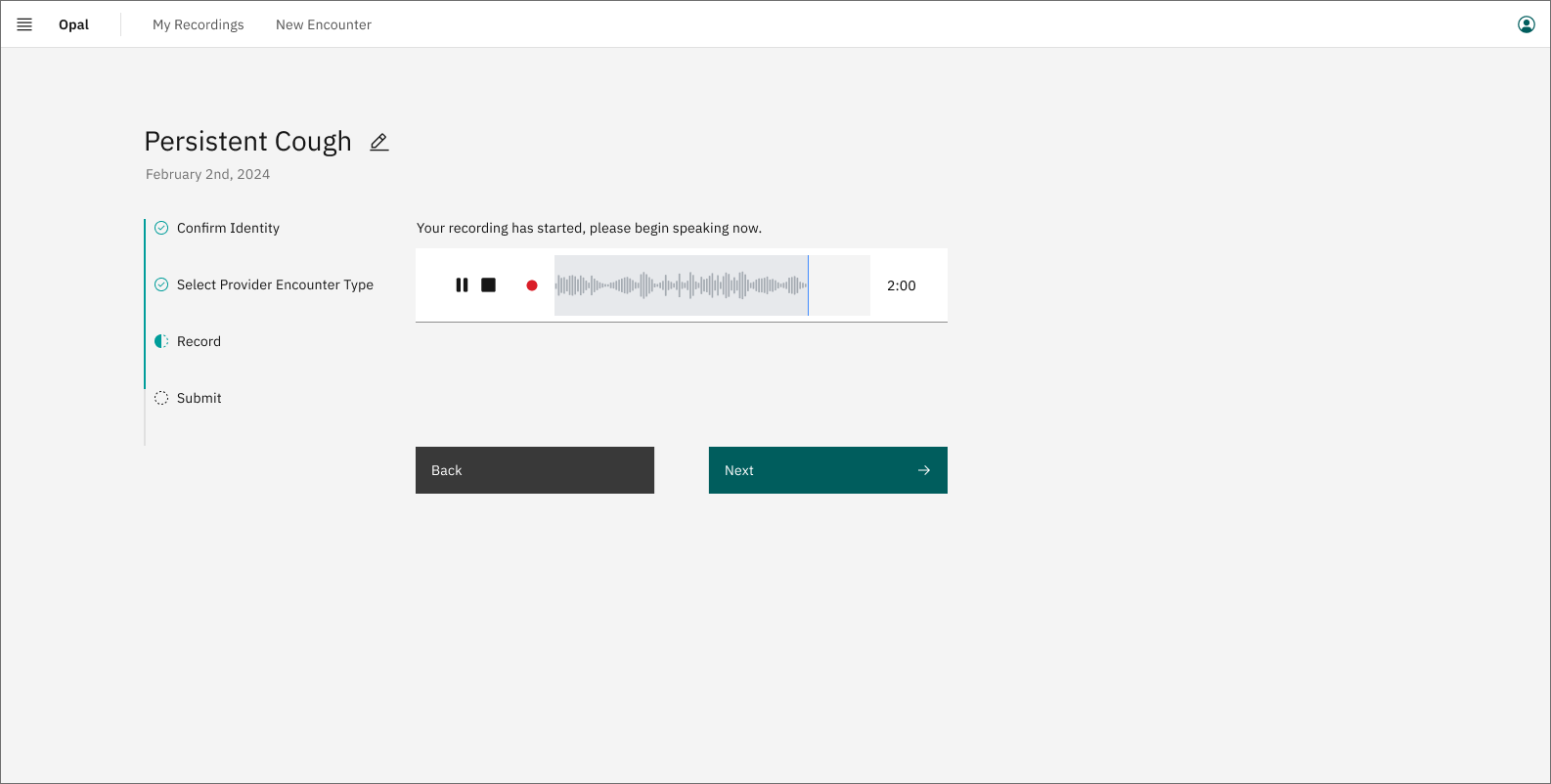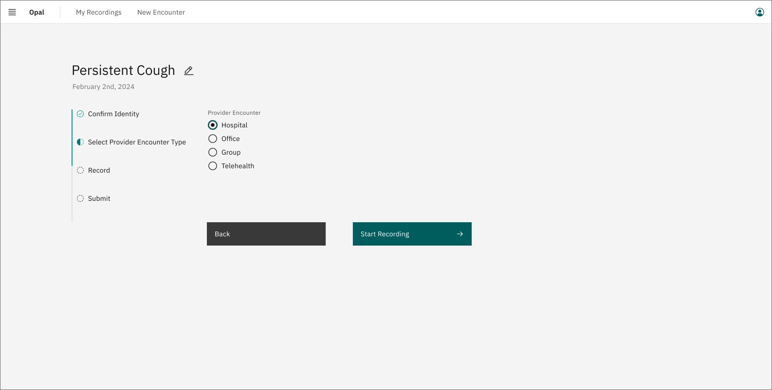 Provider edits title to reason for visit and selects type of encounter and starts recording